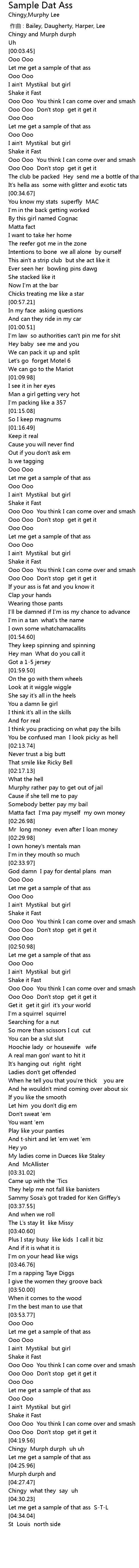 | [04:24.41] | Let me get a sample of that ass |