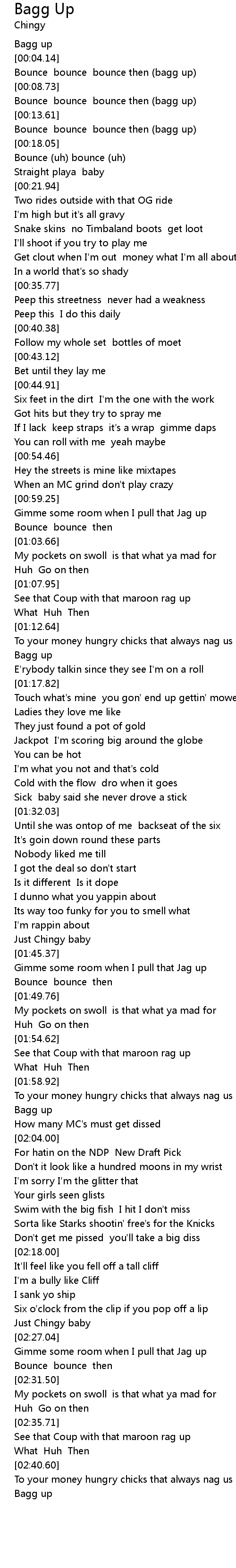 | [02:01.81] | Bagg up |