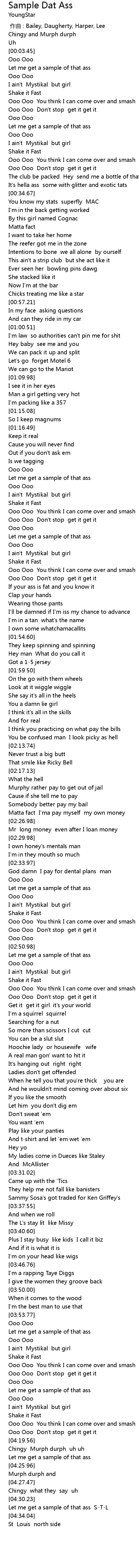 | [04:24.41] | Let me get a sample of that ass |