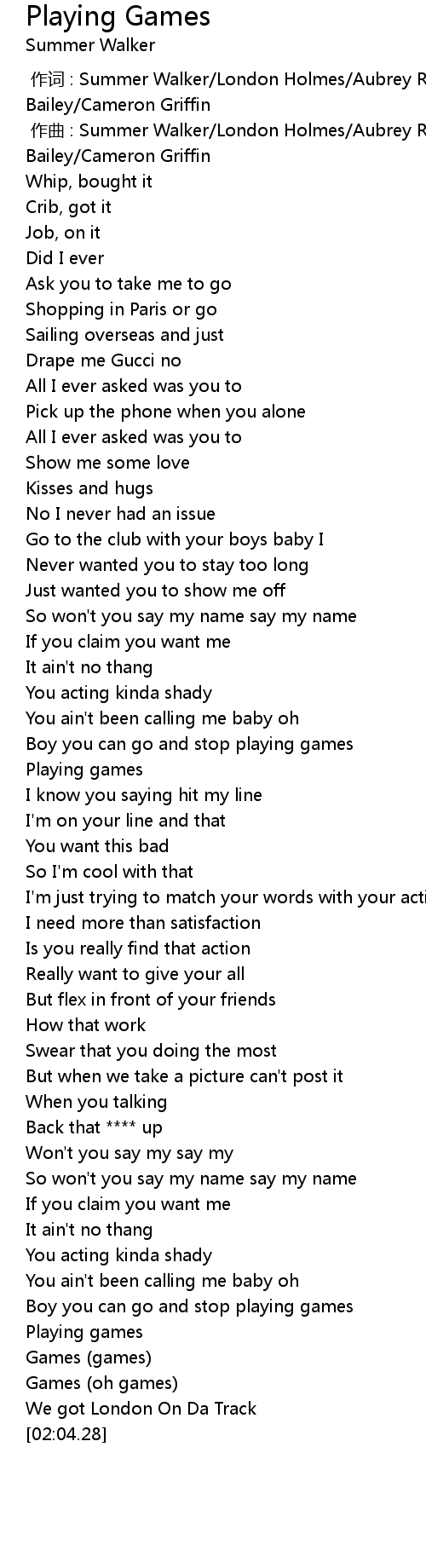 | [00:00.00] | 作词 : Summer Walker/London Holmes/Aubrey Robinson/Kendall Roark Bailey/Cameron Griffin |