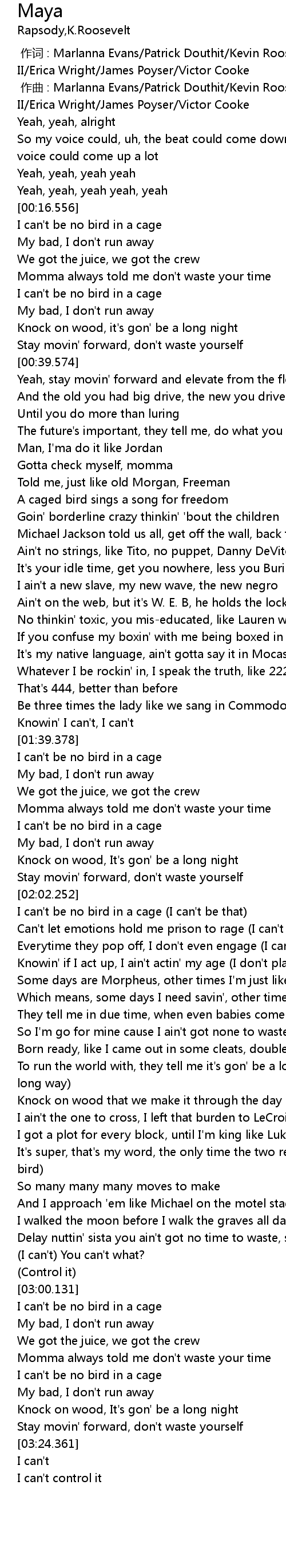 | [02:03.004] | I can't be no bird in a cage (I can't be that) |