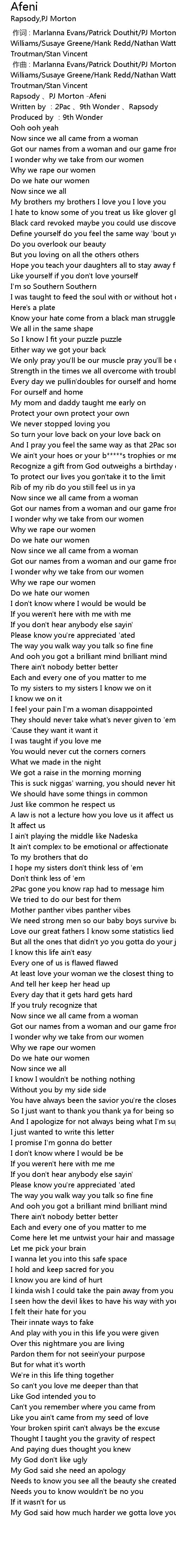 | [00:01.85] | Written by :2Pac 、9th Wonder 、Rapsody |