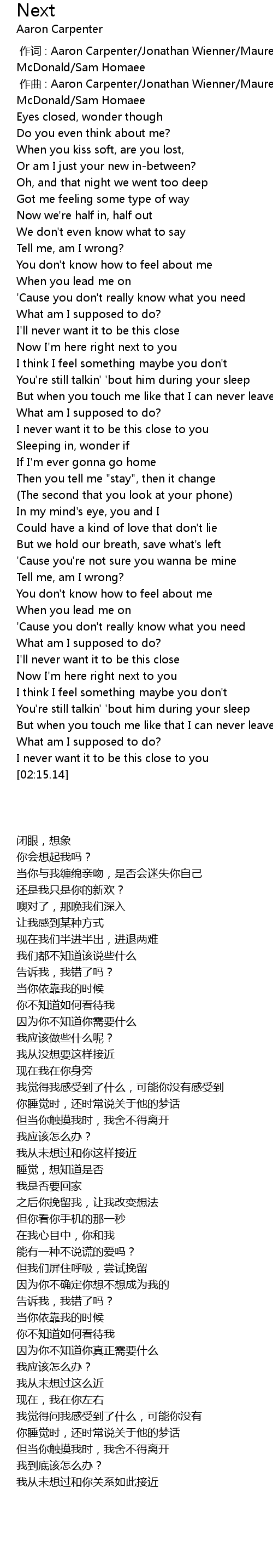 | [00:01.00] | 作曲 : Aaron Carpenter/Jonathan Wienner/Maureen "Mozella" McDonald/Sam Homaee |