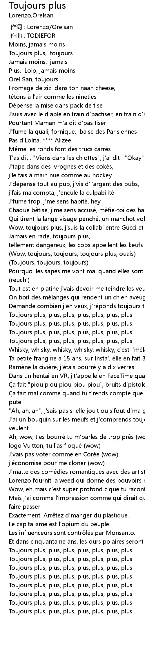 | [02:44.64] | Toujours plus, plus, plus, plus, plus, plus, plus |