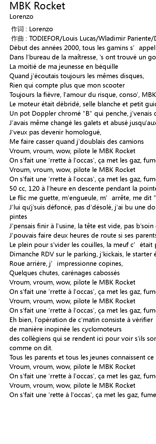 | [00:38.81] | Vroum, vroum, wow, pilote le MBK Rocket |