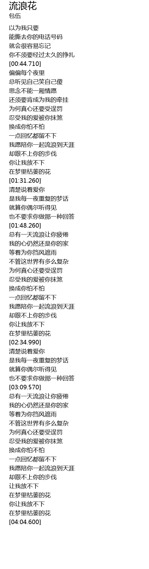| [01:49.190] | zǒng yǒu yì tiān liú làng ràng nǐ pí juàn |