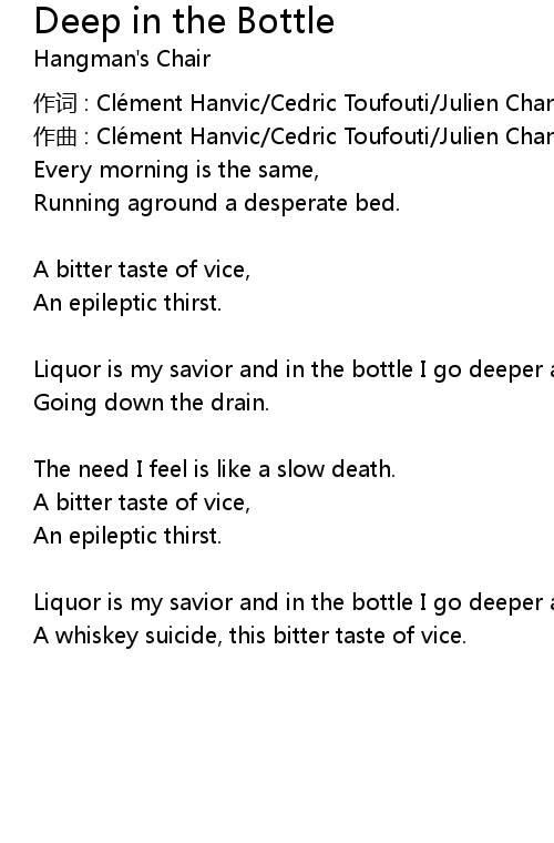 | Liquor is my savior and in the bottle I go deeper and deeper. | |
