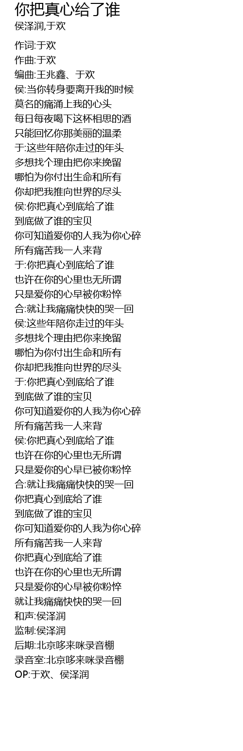 | [02:34.82] | 侯:你把真心到底给了谁 |
