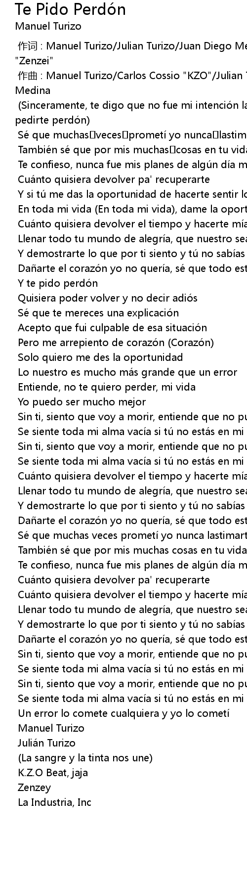 | [00:00.369] | zuò qǔ : Manuel Turizo Carlos Cossio " KZO" Julian Turizo Juan Diego Medina |