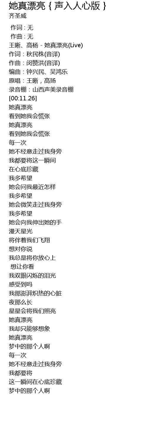| [00:00.59] | 王晰、高杨 - 她真漂亮(Live) |