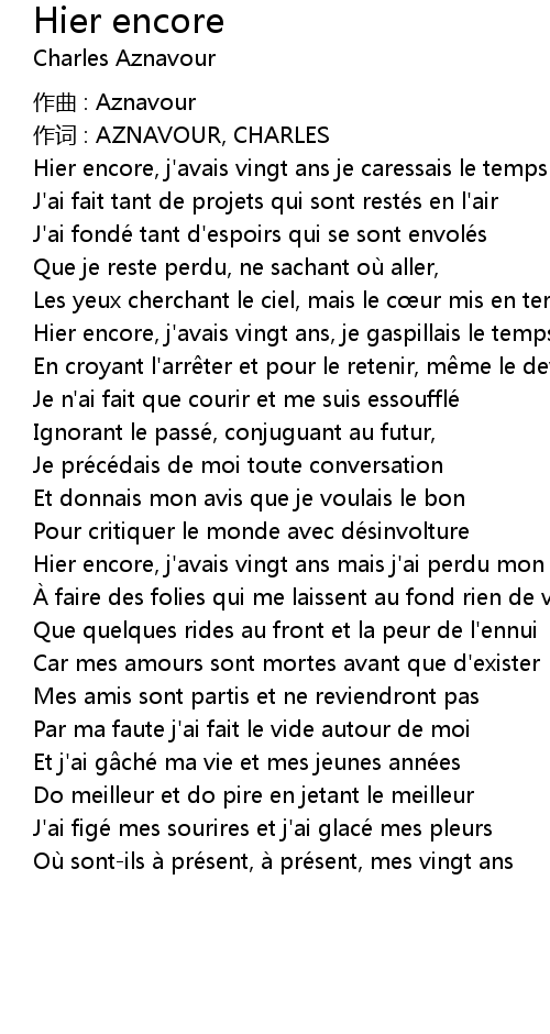| Hier encore, j' avais vingt ans je caressais le temps | |