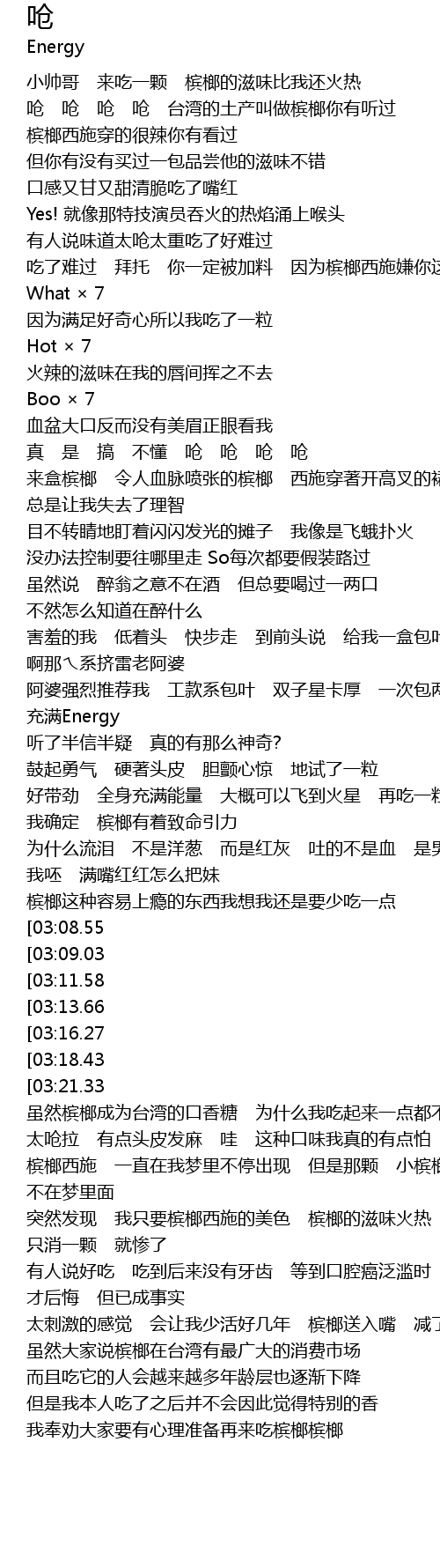 | [02:49.84] | 太刺激的感觉 会让我少活好几年 槟榔送入嘴 减了几十岁 |
