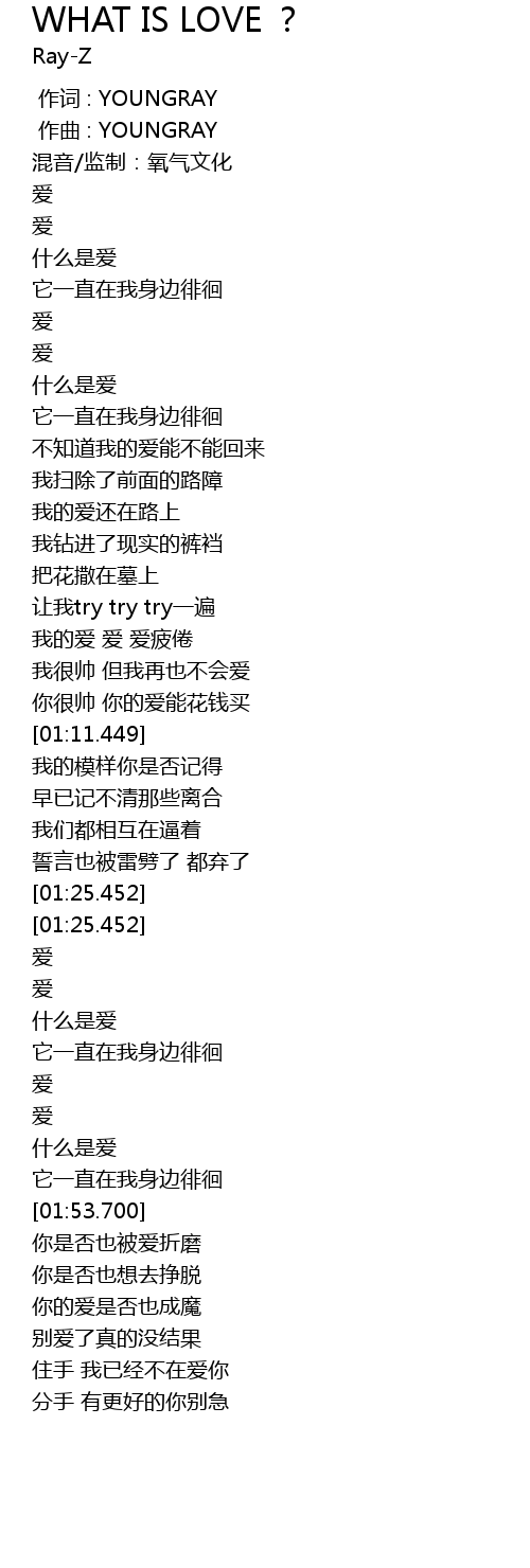 | [01:32.198] | 什么是爱 |