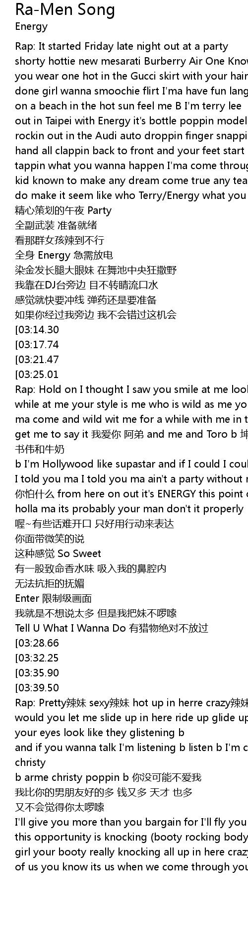 | [02:38.37] | Rap: Pretty la mei sexy la mei hot up in herre crazy la mei |