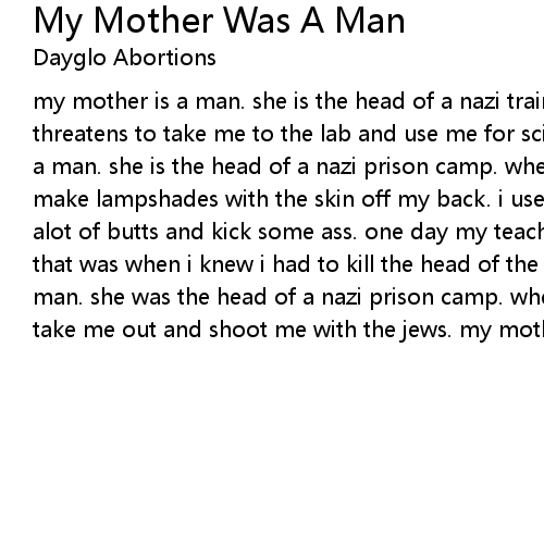 my mother is a man. she is the head of a nazi training camp. when i am bad she threatens to take me to the lab and use me for scientific research. my mother is a man. she is the head of a nazi prison camp. when i am bad she threatens to make lampshades with the skin off my back. i used to skip out of class smoke alot of butts and kick some ass. one day my teacher sent me home with a note. that was when i knew i had to kill the head of the prison camp. my mother was a man. she was the head of a nazi prison camp. when i was bad she threatened to take me out and shoot me with the jews. my mother was a man.