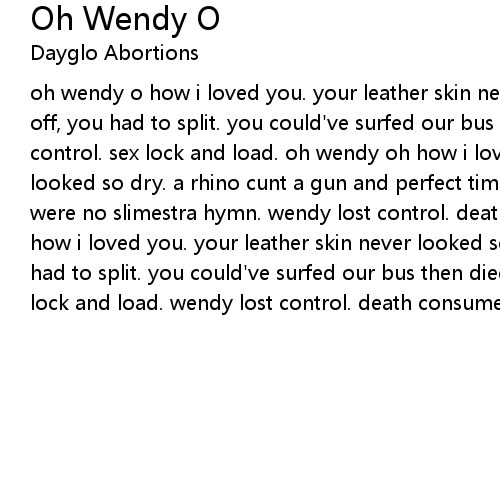 oh wendy o how i loved you. your leather skin never looked so dry. you pissed me off, you had to split. you could've surfed our bus then died. wendy lost control. sex lock and load. oh wendy oh how i loved you. your leather skin never looked so dry. a rhino cunt a gun and perfect tim. you were kinda cool but you were no slimestra hymn. wendy lost control. death consumed her soul. oh wendy o how i loved you. your leather skin never looked so dry. you pissed me off, you had to split. you could've surfed our bus then died. wendy lost control. sex lock and load. wendy lost control. death consumed her soul.