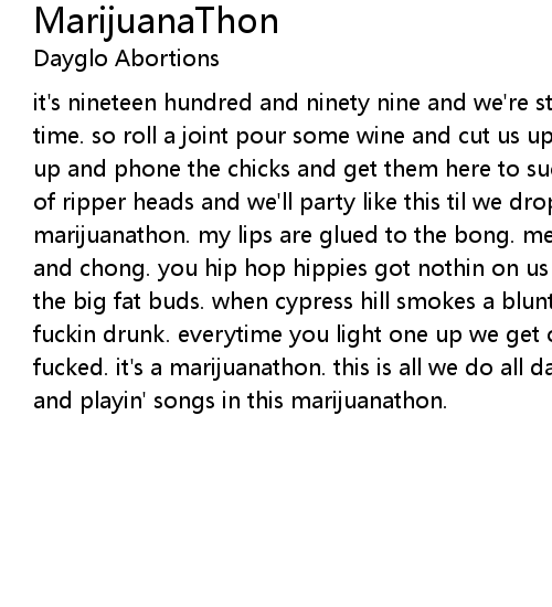 it's nineteen hundred and ninety nine and we're still toastin to the end of time. so roll a joint pour some wine and cut us up a couple of lines. light it up and phone the chicks and get them here to suck our dicks. cuz we're a bunch of ripper heads and we'll party like this til we drop dead. welcome to our marijuanathon. my lips are glued to the bong. me and my bro's are watchin cheech and chong. you hip hop hippies got nothin on us cuz we're the band that grows the big fat buds. when cypress hill smokes a blunt that gives us money to go get fuckin drunk. everytime you light one up we get our cut and go get fuckin fucked. it's a marijuanathon. this is all we do all day long is smokin joints and playin' songs in this marijuanathon. |