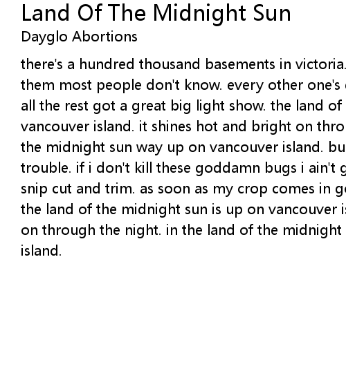 there's a hundred thousand basements in victoria. but there's one thing about them most people don't know. every other one's got a little secret garden and all the rest got a great big light show. the land of the midnight sun is up on vancouver island. it shines hot and bright on through the night. in the land of the midnight sun way up on vancouver island. bubble bubble bubble toil and trouble. if i don't kill these goddamn bugs i ain't gonna get no buds. snip snip snip cut and trim. as soon as my crop comes in gonna buy my gal a diamond ring. the land of the midnight sun is up on vancouver island. it shines hot and bright on through the night. in the land of the midnight sun way up on vancouver island.
