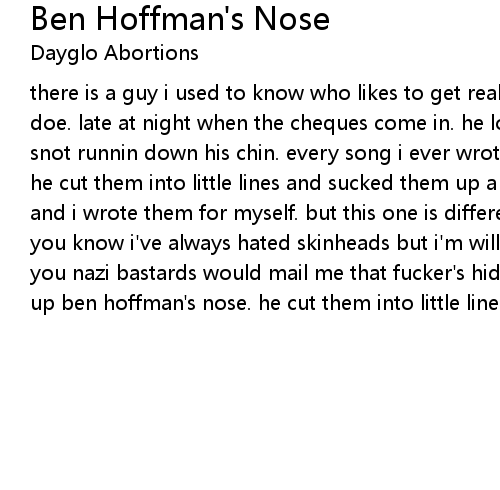 there is a guy i used to know who likes to get really high on other people's doe. late at night when the cheques come in. he looks like jesus bonehead with snot runnin down his chin. every song i ever wrote went up ben hoffman's nose. he cut them into little lines and sucked them up a hose. i wrote alot of song and i wrote them for myself. but this one is different, it's all about revenge. you know i've always hated skinheads but i'm willing to put it aside. if one of you nazi bastards would mail me that fucker's hide. every song i ever wrote went up ben hoffman's nose. he cut them into little lines and sucked them up a hose. |