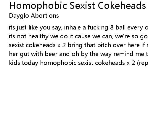 | its just like you say, inhale a fucking 8 ball every other day. we don't care if its not healthy we do it cause we can, we're so goddam wealthy. homophobic sexist cokeheads x 2 bring that bitch over here if she's not willing let's fill her gut with beer and oh by the way remind me that i have to beat my wife and kids today homophobic sexist cokeheads x 2 (repeat first verse) |