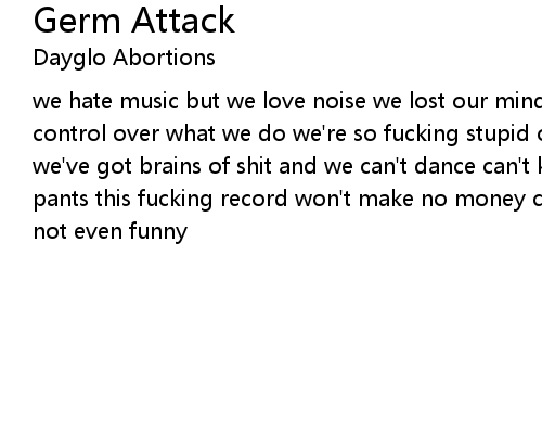 | we hate music but we love noise we lost our minds when we were boys we've got no control over what we do we're so fucking stupid our brains are stew germ attack we've got brains of shit and we can't dance can't keep our hands out of our pants this fucking record won't make no money cause it's so fucking stupid it's not even funny |