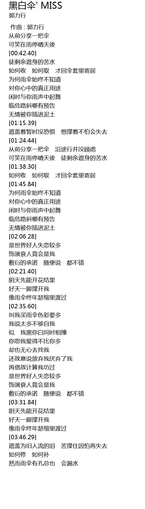 | [01:31.65] | 可笑在雨停晴天後 徒剩余遮身的苦水 |