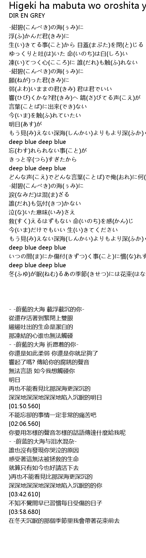 | [03:29.910] | もう見(み)えない深海(しんかい)よりもより深(ふか)くそう深く深く深く眠(ねむ)る君(きみ |