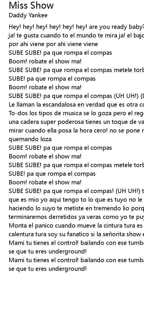 | SUBE SUBE! pa que rompa el compas! (UH UH!) tu no ves que ahi tu tiene todo lo que es mio yo aqui tengo to lo que es tuyo no le pares al desafio sigua sigua haciendo lo suyo te metiste en tremendo lio porque soy de los que no huyo terminaremos derretidos ya veras como yo te puyo puyo | |