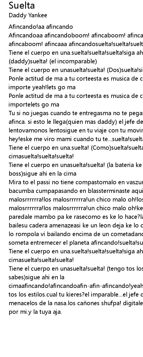 | Tu si no juegas cuando te entregasma no te pegas dime que no te pegassiga afinca. si esto le llega quien mas daddy el jefe de esta bregavamonos lentovamonos lentosigue en tu viaje con tu movimientovamono lentovamonos lento hey! eske me viro mami cuando tu te... suelta! suelta! suelta! Dile | |