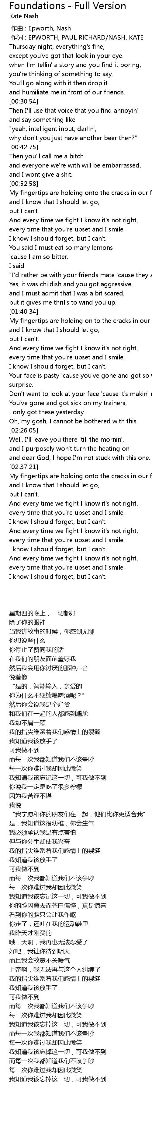 | [00:01.00] | 作词 : EPWORTH, PAUL RICHARD/NASH, KATE |