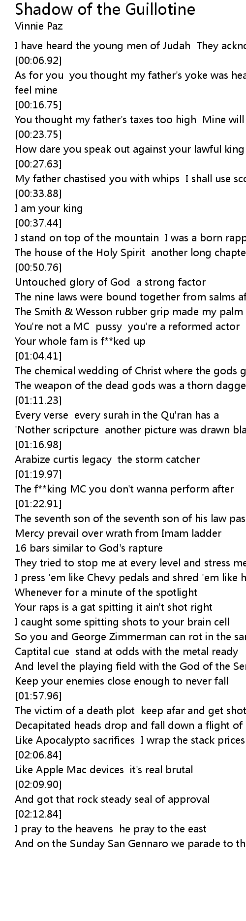 [01:35.67] I press 'em like Chevy pedals and shred 'em like heavy metal