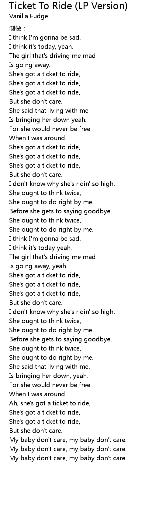 | [02:31.00] | Ah, she's got a ticket to ride, |