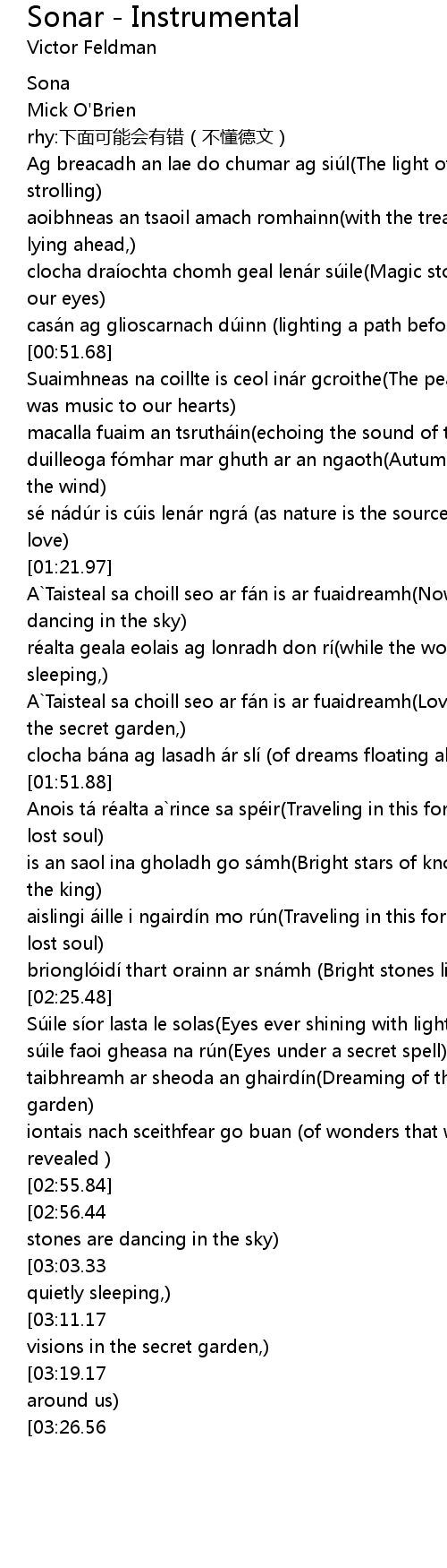 | [01:37.05] | A`Taisteal sa choill seo ar fán is ar fuaidreamh(Lovely visions in the secret garden,) |