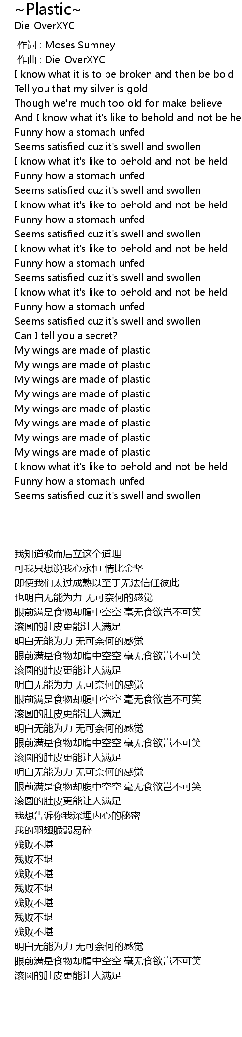 | [01:35.137] | My wings are made of plastic |