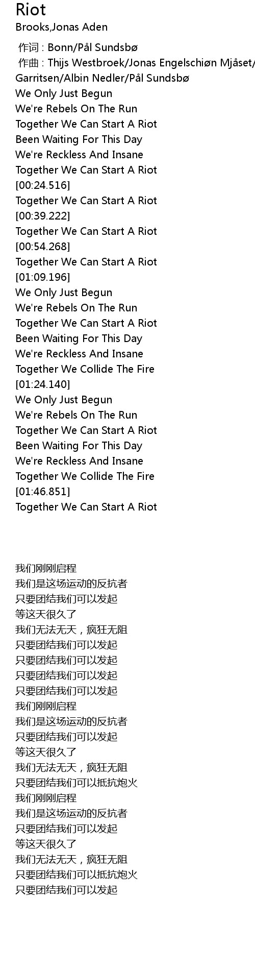 | [01:35.978] | Together We Can Start A Riot |