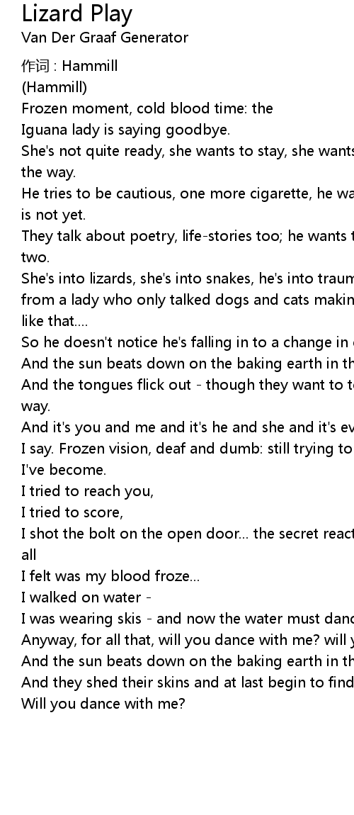 | She' s into lizards, she' s into snakes, he' s into trauma still got the shakes from a lady who only talked dogs and cats making love in the alley she thought like that.... | |