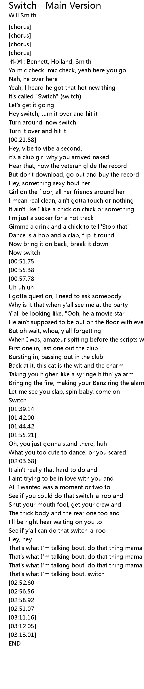 | [03:01.90][02:52.60][02:43.36][02:34.10] | Hey switch, turn it over and hit it |