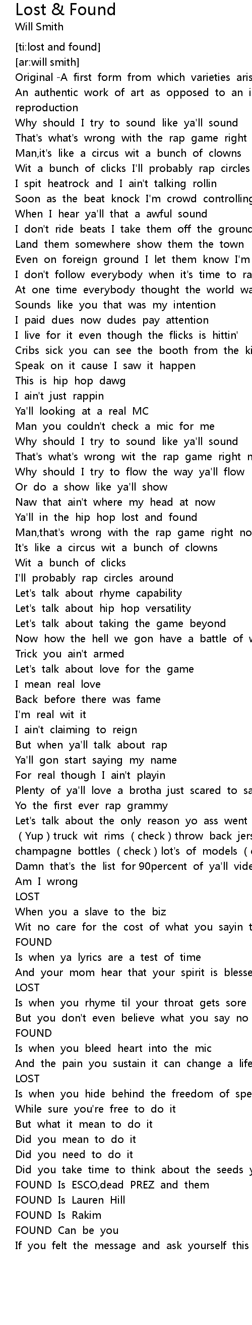 | [01:29.243] | Ya' ll in the hip hop lost and found |