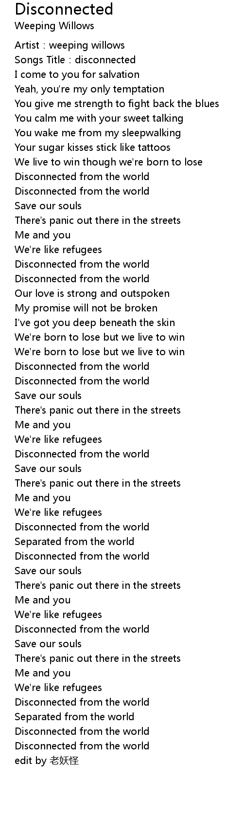 | [03:01.09] | Disconnected from the world |