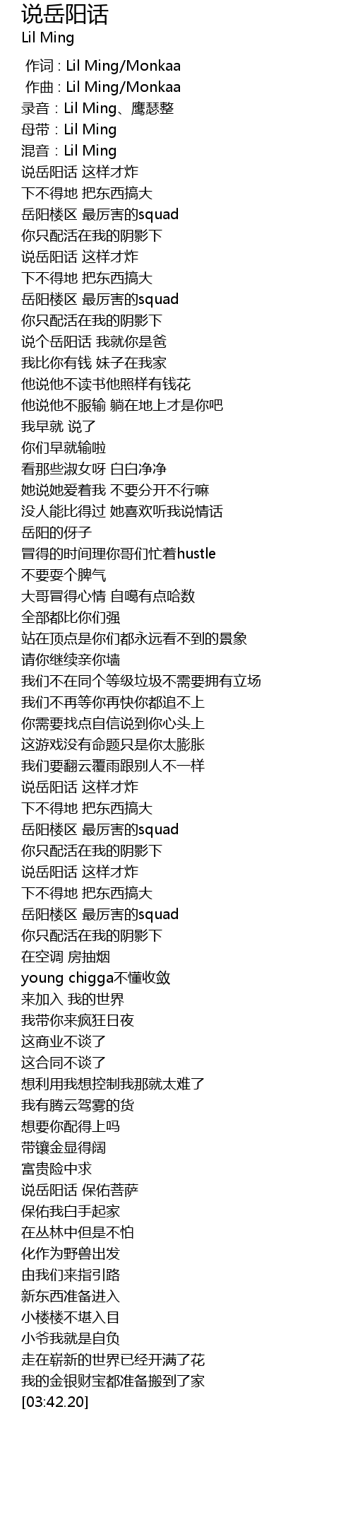 | [00:17.72] | 说岳阳话 这样才炸 |