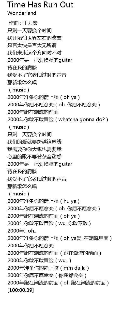 | [100:00.27] | 2000年跑在潮流的前面(oh ya) |