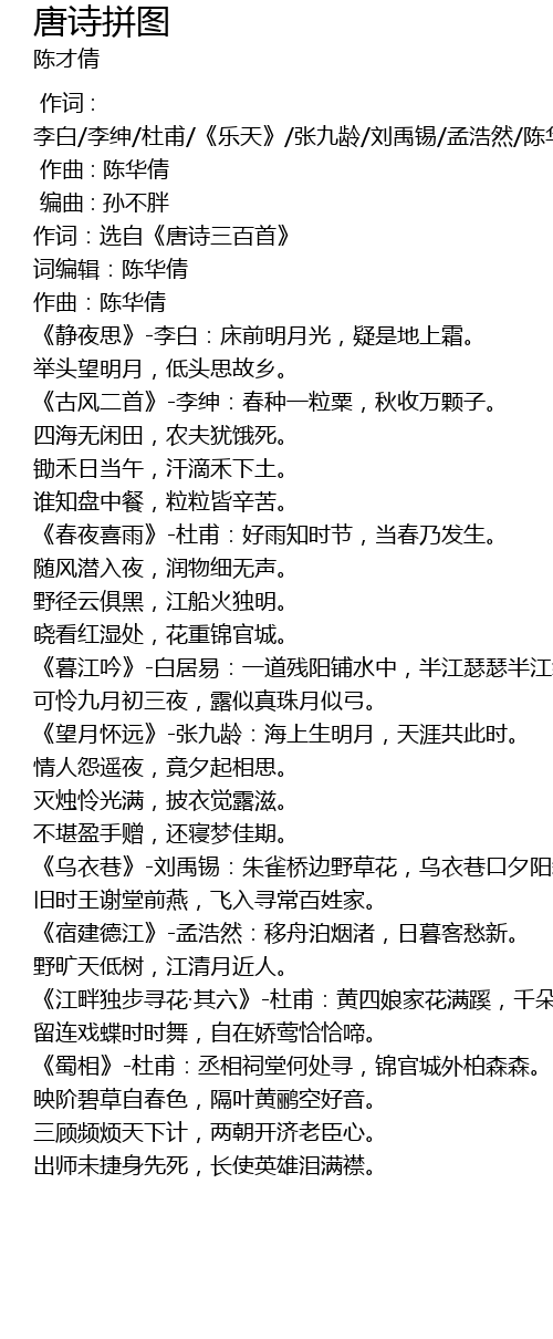 | [00:00.000] | 作词 : 李白/李绅/杜甫/《乐天》/张九龄/刘禹锡/孟浩然/陈华倩 |
