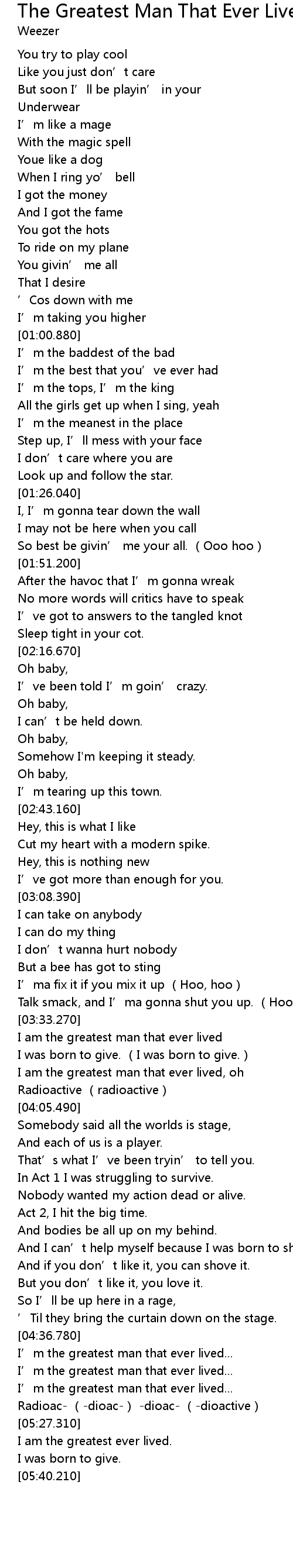 | [03:49.440] | I am the greatest man that ever lived, oh |