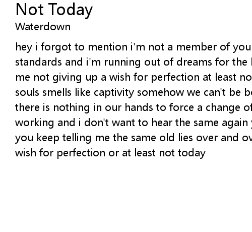 hey i forgot to mention i'm not a member of your team i just can't accept your standards and i'm running out of dreams for the hopeless i grasp what's left for me not giving up a wish for perfection at least not today the armour of our souls smells like captivity somehow we can't be bold for a lack of strategy there is nothing in our hands to force a change of ways the configurations are working and i don't want to hear the same again your pathetic lies bind my hands you keep telling me the same old lies over and over again i'm not giving up the wish for perfection or at least not today |