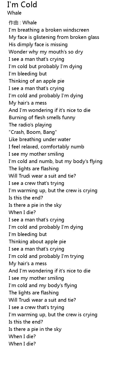 | [00:56.755] | I'm cold but probably I'm dying |