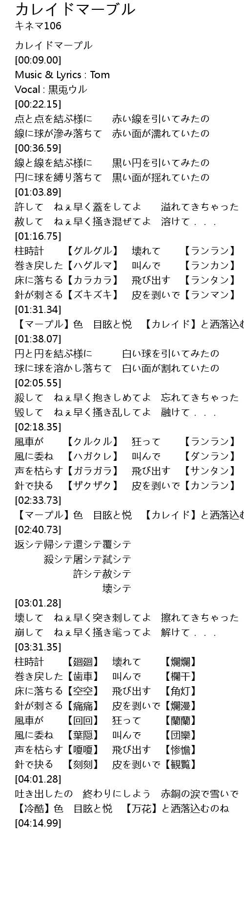 | [01:31.37] | 【マープル】色 目眩と悦 【カレイド】と洒落込むのね |