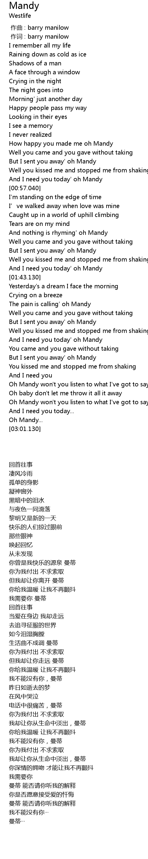 | [02:41.260] | Oh Mandy won' t you listen to what I' ve got to say |
