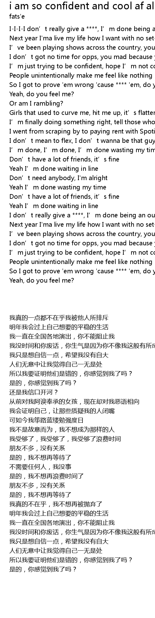 | [01:27.86] | I' m just trying to be confident, hope I' m not cocky |