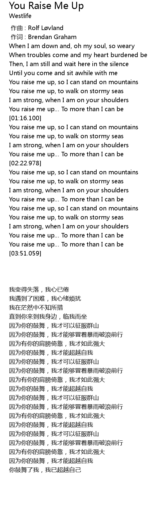 | [02:28.690] | You raise me up, so I can stand on mountains |
