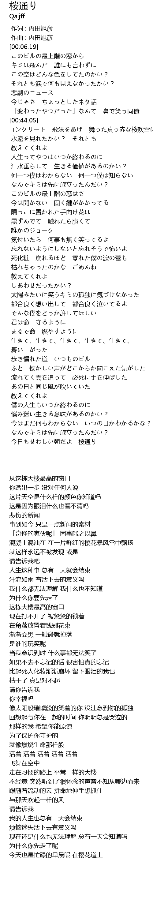 | [00:44.05] | コンクリート 飛沫をあげ 舞った真っ赤な桜吹雪に |